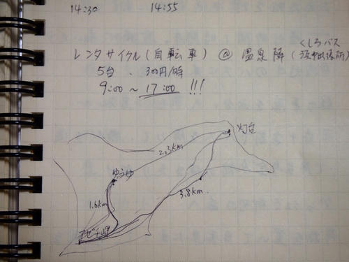 → 温泉ゆうゆう行きの連絡バス → 14:55温泉着、隣で自転車をレンタル